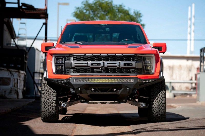 The Stealth Fighter has been our most popular line of bumpers, and for good reason. It is one of our tightest fitting bumpers and is synonymous with the Raptor in the off-road community. This was designed to closely follow the Raptor’s body lines, and provides better ground clearance and approach angle than the OEM bumper. The front of the bumper sticks out only 1/2-inch further than the OEM bumper in order to fit LED lights within. The center light mount can accommodate either a 40-inch radius LED light bar, or up to 10 LED cube lights. There are 2 side mounts for Rigid 10-inch SR LED light bars on either side of the bumper for additional lighting. These mounts sit behind satin black aluminum panels with vented slots, so if you decide to not mount any side lights there are no empty holes in the bumper.